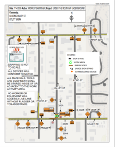 The north corner of Valley Street at Galley Road will be closed to accommodate routine utility work being performed by Under the Mountain Underground. The work includes tapping an existing waterline to install a fire line that will supply the fire suppression system for the building located at 1015 Valley Street.